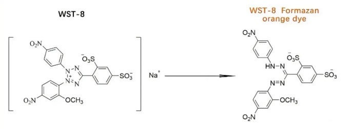 CCK8全稱Cell Counting Kit-8試劑,可用于簡便而準確的細胞增殖和毒性分析。其基本原理為:該試劑中含有水溶性的四唑鹽WST-8[化學名:2-(2-甲氧基-4-硝基苯基)-3-(4-硝基苯基)-5-(2,4-二磺酸苯)-2H-四唑單鈉鹽],它在電子載體1-甲氧基-5-甲基吩嗪鎓硫酸二甲酯(1-Methoxy PMS)的作用下被細胞中的脫氫酶還原為具有高度水溶性的黃色甲瓚產物(Formazan dye)。生成的甲瓚物的數量與活細胞的數量成正比。因此可利用這一特性直接進行細胞增殖和毒性分析。