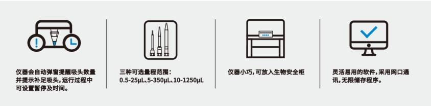 ● 寬廣的量程 :0.5-25 μL 、5-350μL 、10-1250μL 、無需更換移液模塊 ,就可輕松實現(xiàn)24 通道 、16通道 、 1-12 通道應用的自由轉換